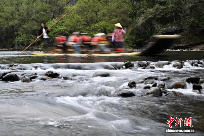 3月22日,祸修北仄,游人趁坐竹筏正在武夷山邦家花园9直溪下游览。秋日里,武夷山邦家花园谦目苍郁,景致如绘。中新社记者 弛斌 摄